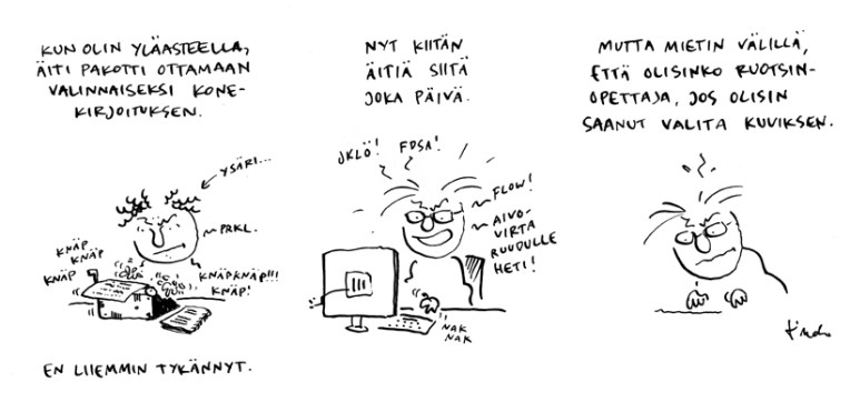 Heh.. Mulla ei ollut yläasteella muita valinnaisia ku köksä ja saksa.. Kuviksen otin musiikin sijaan, meillä piti valita sillä tavalla.. Lieko konekirjoitusta edes tarjolla tänä päivänä?