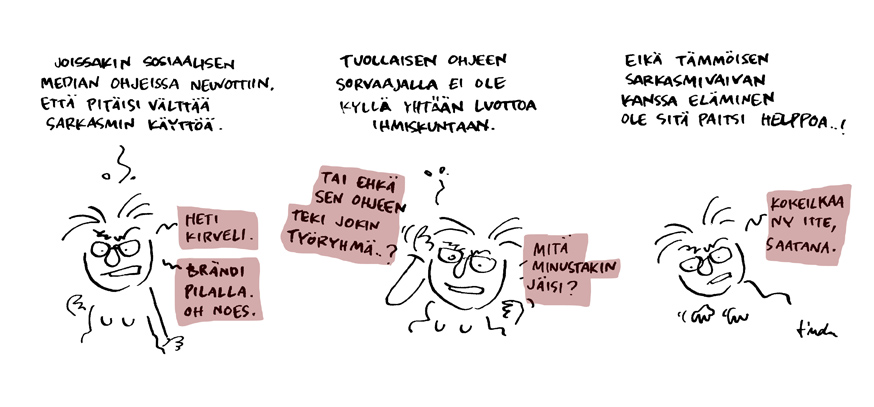 Sarkasmi, tuo universaali elämää, positiivisuuspirkkoja ja brändiä uhkaava ilmiö. 05.07.2011 | saurau Tykkäätkö? Jaa Facebookissa(Avautuu uudessa ikkunassa) Facebook Jaa X:ssä(Avautuu uudessa ikkunassa) X Share on LinkedIn(Avautuu uudessa ikkunassa) LinkedIn Share on WhatsApp(Avautuu uudessa ikkunassa) WhatsApp Email a link to a friend(Avautuu uudessa ikkunassa) Sähköpostitse Tykkää Lataa... Aiheeseen liittyy