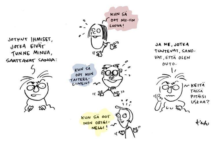 1. Tykkään piirrkoksista. Teen niitä ajoittain itsekin. Niiden avulla asiat pelkistyvät. Huomasin vasta kolmannella lukemisella, että G+ ollut piirroksesi oli syntynyt ”tylsän Vanhasen” puheen aikana (joku toinen kommentoi). Huomioni kohdistui kokonaan piirrokseen ja välittämääsi monitulkinnalliaseen viestiisi ja Matti jäi varjoon. Hyvä niin 😉