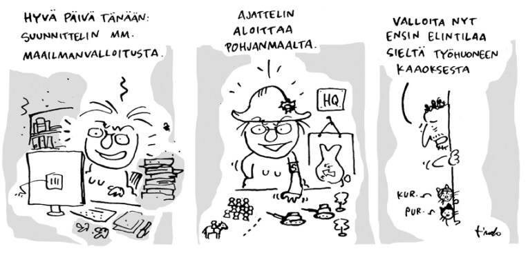 1. Samalla kaavalla. Työhuoneessani on vielä vuoden takaisen muuton (Loviisasta Sotkamoon) ja muiden järjestelyjen takaisia tavaroita, jota pitäisi siirtää toiselle puolelle taloa, mutta maalimanvalloituksen takia tämä mikrotason Lebensraum on edelleen niukka ja rajallinen. Toinen juttu: kuutio paperia ja leikkeitä roviolle ja hyllyihin tulisi lisää tilaa asiallisille ja ajankohtaisille kamoille.