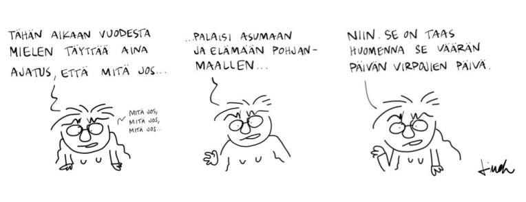 1. Se on kyllä jämerä juttu, jotta lähti tästä etelähän tai pohojaasehen, niin joka paikas muolla virvootahan vääränä päivänä. 😀