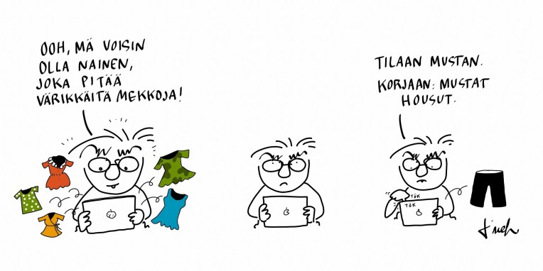 1. Joo-o. Monta kertaa oon lähteny kauppahan sillä mielellä, jotta ”tällä kertaa mä ostan jotaki muuta ku mustaa”. Hmm… oon mä joskus ostanu sitte jopa harmaata.