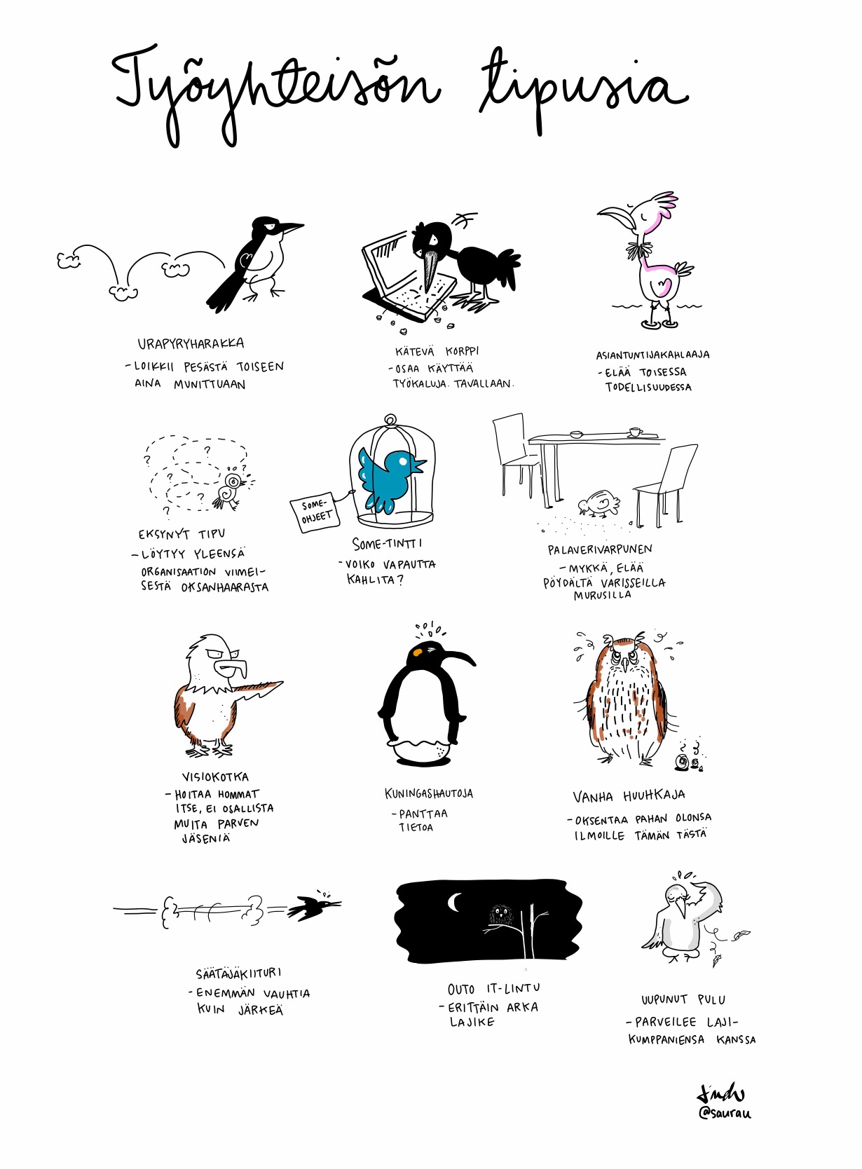 Työyhteisön tipusia 15.01.2018 | saurau Muistan joskus piirrelleeni opettajainhuoneen lintukirjan. Olisiko tämä jatko-osa sille? Tykkäätkö? Jaa Facebookissa(Avautuu uudessa ikkunassa) Facebook Jaa X:ssä(Avautuu uudessa ikkunassa) X Share on LinkedIn(Avautuu uudessa ikkunassa) LinkedIn Share on WhatsApp(Avautuu uudessa ikkunassa) WhatsApp Email a link to a friend(Avautuu uudessa ikkunassa) Sähköpostitse Tykkää Lataa...